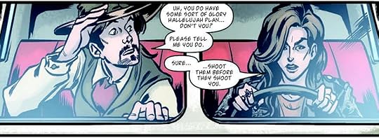 The relationships were odd here. I was constantly distracted by trying to figure out when this was supposed to take place in relation with the series, with "John Henry" running around, and Dolls taking Wynonna on missions to kill zombies and chupacannibals. And Wynonna keeps getting people killed because she's hot-headed, and Dolls keeps chastising her for not being a better agent. (Considering she hasn't had any training, I'm not sure what he can realistically expect.) Peacemaker doesn't appear until page 93 of a 120-page book; prior to that, she "blams" away right and left with apparently ordinary weapons. Basically, everything that makes the story the story on Syfy is missing or askew. Where are the sisters? What about the curse? What are they all doing out of Purgatory? Is it really supposed to be spelled Beau Beau? Some of these questions are answered in the last third or so of the book - but it's all just very odd.
