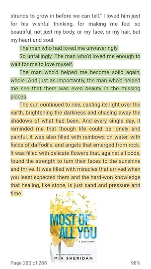 “It’s my belief that the wisest and most sensitive souls are those who have been broken themselves and found a way to put their pieces back together. For who can know the true meaning of light unless they’ve been immersed in darkness? Who else can say, “I’ve been there, and I promise you — I promise you — there is life after this. Yes, even this.” Who else can determine with love and wisdom who’s worth suffering for? … MOST OF ALL YOU is a story about the power of love such as this. Love that comes from a place of light, of hope, of knowing. Love that says you are worth suffering for, but even more so, love that promises: Your heart will heal — it was what it was made to do.”