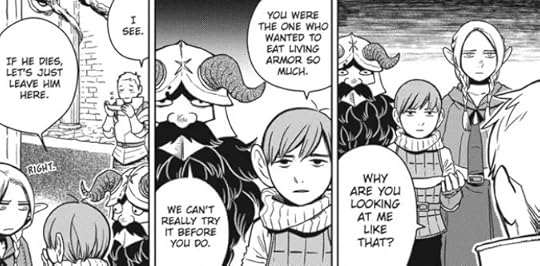 I say "creative" and "dull" because Delicious in Dungeon spends far more time telling rather than just showing and trusting you to know what you're looking at. It spends pages explaining the different kinds of "man-eating plants" and why they aren't really man-eaters. It has an interesting theory about living suits of armor that was surprisingly boring to sit through (creative because "not magic, mollusks!" but boring because dragged on far too long and even made for a boring fight).