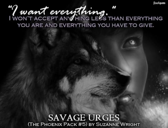 "Feasting and dominating, licking and biting. His body hurt. Ached. Demanded her. She gave as good as she got, fed him cock-torturing little moans and sucked on his tongue. Her taste and scent tantalized his senses and ate at his control."Told in dual POV, Savage Urges is another winning addition to the Phoenix Pack Series. Kenna and Ryan complimented each other well. Brotherhood and family bonds with-in the pack continue to be a driving force in this series. Ms. Wright never fails to have the perfect blend of action and steam to keep me engaged the entire read. The plot was well constructed, and the pacing was practically perfect. I always look forward to getting back to these characters. The heroes are fiercely protective and sexually charged when it comes to their mates!