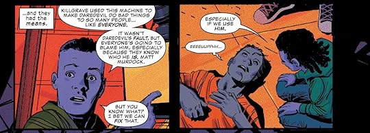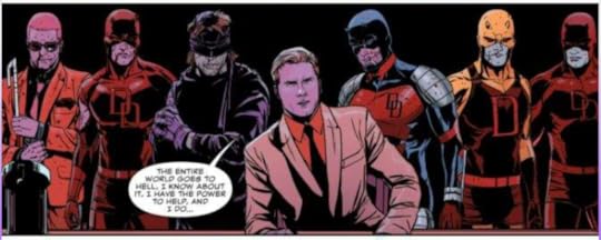 It starts with Matt putting a hit on himself after what happened to Sam and then we see him fighting villains and then Bullseye and we get their secret history and all and an okayish confrontation but the big thing is when he finally reveals in a confession to a father how people forgot his secret identity and it has to do with his time in SF and how he saved the purple children from their father, Purple man and its an interesting story, mind control and all and feeling grateful they wiped everyone's memory of Matt being Daredevil.