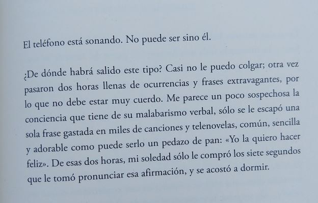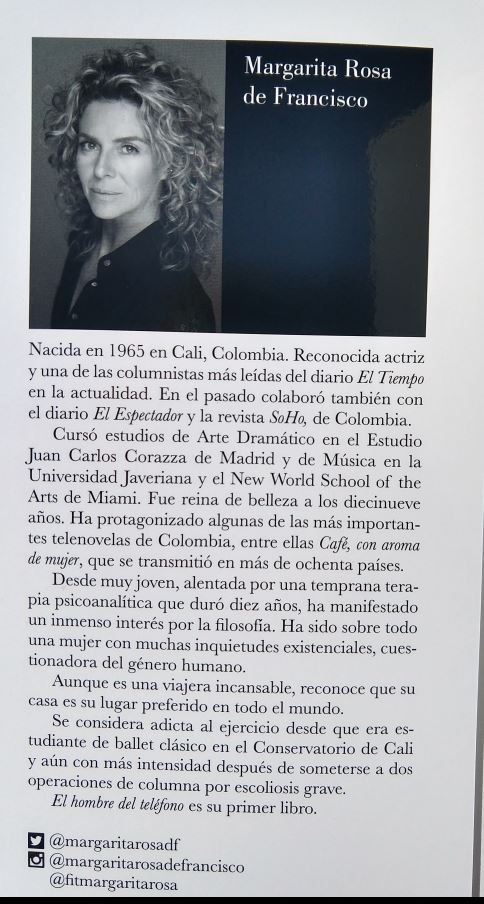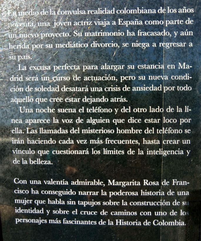 Lo más bonito y a la vez difícil de este libro para mí fue el final. Margarita Rosa de Francisco fue posiblemente una de las últimas mujeres que salió con Jaime Garzón. El la enamoró sólo con llamadas telefónicas que le hacía a Madrid mientras ella trataba de pasar la tusa de su divorcio con un amante cobarde y patético. Al final esas llamadas y sus clases de actuación eran lo que le daba sentido a su vida en medio de tanta desolación y tristeza. Conocer al hombre del teléfono y encontrarse con un ser que aunque maravilloso no encajaba con ella no dejó de ser un desamor más en la lista que ya venía haciendo.