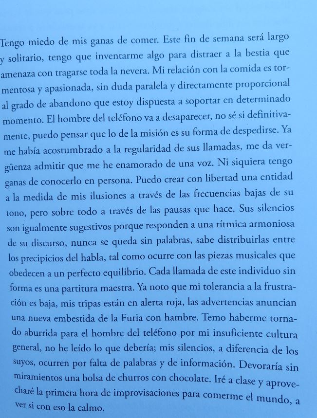 Además de su experiencia en España y con el hombre del teléfono, Margarita intercala algunos capítulos escritos en itálicas en cuyas páginas rememora algunos aspectos de su juventud y también trata de ser un poco lírica o poética con el lenguaje.
