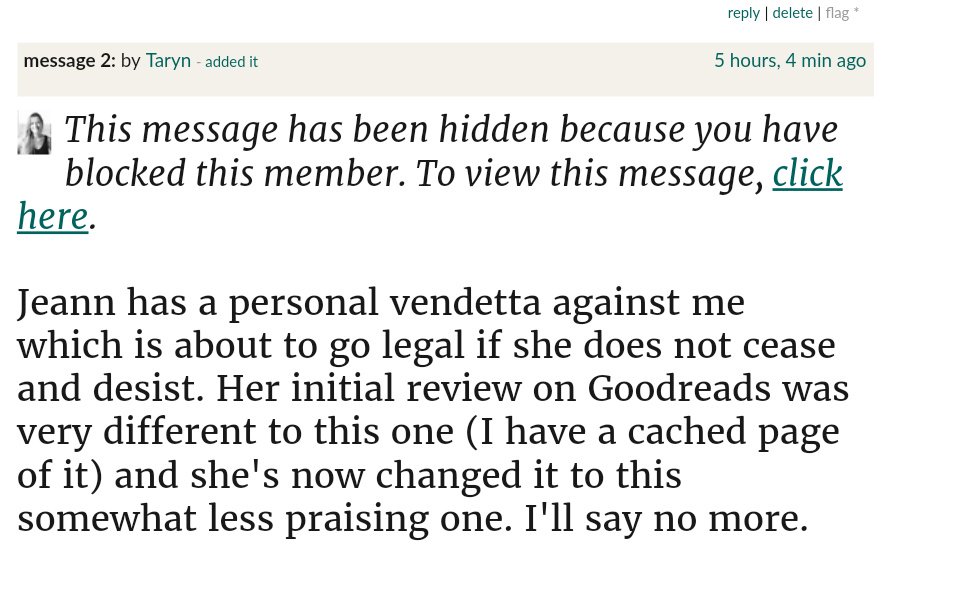 This author threatened a reviewer with legal action over a two-star review. I personally think that Jeann was being generous. What a mess, that’s three hours of my life I’ll never get back - but apparently Goodreads is on a deleting spree of all the negative reviews for this book. Listen, no one has to have a personal agenda to rate this book poorly. Nothing any reviewer can write will be more damning than the actual novel itself.