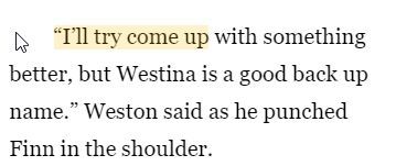 Weston is the sort of young person that you occasionally meet and think 'they have an old soul.' He is still a typical teenage boy but one you can have great conversations with. As he gets older and develops into a young man, he begins to subtlety flirt with Tory. It is often done in a joking kind of way and most of the time he does it to get a rise out of Finn. However, from about the age of 18, Weston knows he is in love with Tory.