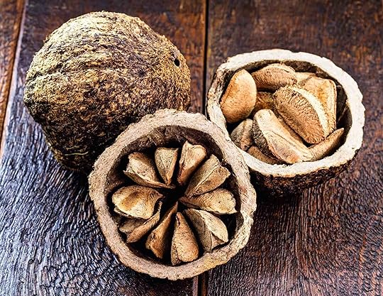 But Aldred's apparent death wish aside, this is a beautifully written paean to la vie naturelle, in particular life among some of the planets oldest and most majestic creations. As with most such non-fiction audiobooks, I combined this with the physical book as well so that I could enjoy the far-too-few photographs, and was also frequently checking Google images for pictures of Britain's ancient yews, Morocco's Atlas cedars, and Borneo's towering dipterocarps, among others. Along the way, I also learned surprising details about where Brazil nuts come from (they're clumped together inside enormous pods, and - until we human idiots just dry the shit out of them - the individual nuts can be peeled like an orange, and have a texture like fresh coconut - see below); as well as what it's like to be attacked by a harpy eagle while dangling 150 feet above the ground...and WAY more than I ever wanted to know about being infected with botfly maggots, (NOT shown, and Google at your own risk).