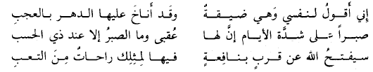 🍀إني أقول لنفسي وهي ضيقة وقد أناخ عليها الدهر بالعجب صبراً على شدة الأيام إن لها عقبى وما الصبر إلا عند ذي الحسب سيفتح الله عن قرب بنافعة فيها لمثلك راحات من التعب