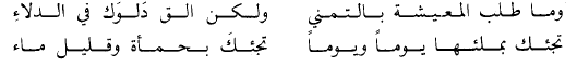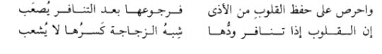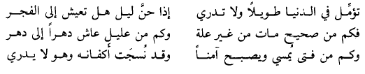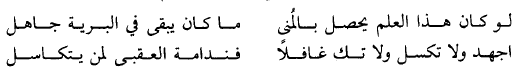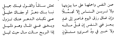 ليس البلية فى أيامنا عجب ... بل السلامة فيها أعجب العجب ليس الجمال بأثواب تزيننا ... إن الجمال جمال العقل والأدب ليس اليتيم الذي قد مات والده ... إن اليتيم يتيم العلم والأدب