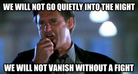 Remember in the movie "Independence Day" how Bill Pullman's character gave like THIRTY-SEVEN of those "you guys are great, you mean the world to me, here's why, go team" inspirational, pat-on-the-back speeches?