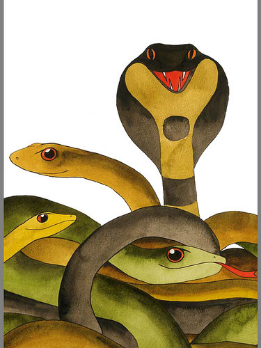 Matt Sewell provides a full page of watercolor illustrations of groups of animals and 1-2 paragraphs of information on the critters, where that particular group name came from, or just his general thoughts on these animals and their group names.