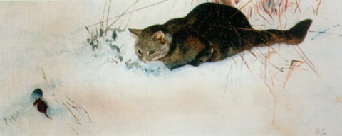 These are my favourite Cat in Art from this collection. Two of them have birds in them because I also love birds: (Bruno Liljefors's A Cat Stalking a Mouse in the Snow, 1892. Photo from artnet.com)