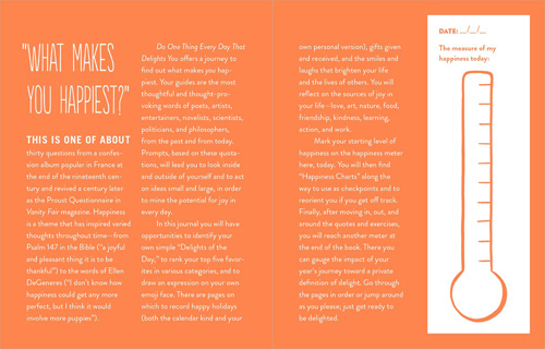 Each day presents an opportunity to find delight, whether in your surroundings, your work, your relationships, your insights, or your actions. This journal will guide you to look inside and outside yourself to discover and appreciate what makes you happiest.