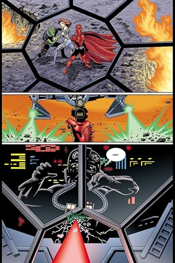 The comic keeps up a brisk pace from start to finish, but the highlights come from the constant action. This isn't relentless fighting, as there are breaks in between battles and moments for character development, but it's clear someone in the writing room was having a lot of fun thinking up these fights. From the opening bar room battle to the the showdown on the ruined Royal Guard training grounds, the tale here is spectacular in how it handles each fight. Every few pages you're offered something striking, some memorable scene to help highlight the battles, from Kanos managing to take out a TIE Interceptor on-foot to the surprising new arrival which forces a Star Destroyer to surrender. There's enough of these moments to always make you feel satisfied, and to think back to each fight one after the next. Plus, it helps that the final two major engagements are pure visual poetry. I will not show the fight in full, but here's how it starts: