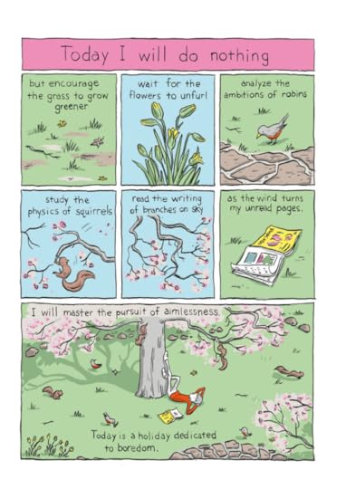 "Today I will do nothing... but encourage the grass to grow greener, wait for the flowers to unfurl, analyze the ambitions of robins, study the physics of squirrels, read the writing of branches on the sky, as the wind turns my unread pages. I will master the pursuit of aimlessness. Today is a holiday dedicated to boredom." pg 72