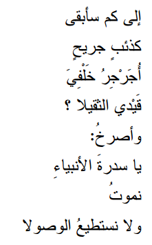 أَوَكُلَّمَا اشْتقْنَا إلى حُرِّيةٍ أعطَوا لنا حُرِّيَّةَ الأحزانِ!؟ ___ هُمْ يُخْجَلُونَ الشِّعْرَمِن نَزَوَاتِهِمْ وأنا عَبَدْتُ الله في ألْحَاني ___
