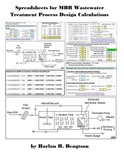 This e-book provides background information about the MBR (membrane bioreactor) wastewater treatment system and detailed discussion of process design calculations for this process. It is a relatively recent addition in the wastewater treatment field. Combining an aeration tank with membrane filtration instead of a secondary clarifier, results in a more compact system than conventional activated sludge that produces a higher quality effluent. The discussion of process design includes sizing the membrane module, calculation of the scouring air flow needed, sizing the aeration tank, calculating the air flow needed for the aeration tank, and sizing a pre-anoxic tank for denitrification. Numerous Excel spreadsheet screenshots are including showing the layout of a spreadsheet to make the process design calculations.
