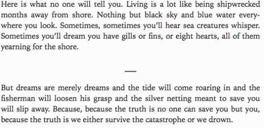 Refuse the drowning, refuse the pull of salt water on your skin, refuse the tide, refuse the storm. Write yourself into existence because no one will. -- the historian