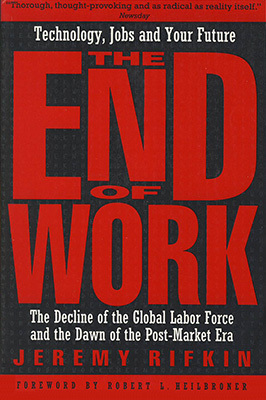It was about that time that I first read Jeremy Rivkin’s book, THE END OF WORK: THE DECLINE OF THE GLOBAL LABOR FORCE AND THE DAWN OF THE POST-MARKET ERA, which was published in 1995. It is filled with statistics that highlight the great economic transformation that was and is occurring at the expense of the mass labor market. Reading the book is an enlightening experience but attempting to review it is a daunting one.