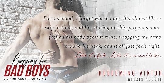 Redeeming Viktor by Alexis Abbott I am a big Alexis Abbott fan and this was the first story I read in this boxed set. These two were just sweet, 2 people trying to find their way in the world. She is a stripper when he meets her, he just got out of the armed forces. They have one passionate night together, before he ends up going away for 5 years. This was the only part of the story that didn't work for me. He vets into an altercation right in front her of her work place, gets arrested and does 5 yrs. in prison. 1. It never says the guy died, so I wasn't sure why her got so many years. 2. She doesn't know what happened to him, not sure how since it was right in front of where she worked and he was there to pick her up. Those two things were odd for me personally. Having said that, I did really like these two and that they had a sweet reunion and he got a great surprise.