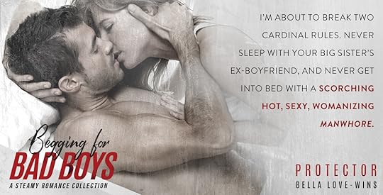 Protector by Bella Love-Wins features Reid and Robin. Reid and Robin's sister had a relationship in high school and he left her high and dry to enlist. Robin has always hated Reid for what he did to her sister, and now that she's seen him again, she wastes no time in letting him know exactly what she thinks of him. If you like your bad boys with a dose of action and suspense and a steamy connection, look no further than this one.