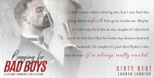Dirty Debt by Lauren Landish features Ryker and Sarah. Ryker is on a quest of vengeance to take down the man who killed his father. He wants everyone to know that Sarah's husband, Jacob, isn't the upstanding citizen he portrays himself to be, in fact, he's a crime lord. When Ryker kidnaps Sarah, he doesn't know that he'll end up falling for her. Action, suspense and steam in this one!
