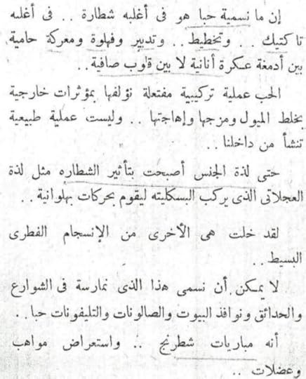 اسم الكتاب في واد ومحتواه بواد اخر كنت اتمني من الكاتب ان يتعمق بالموضوعات المهمة وخصوصا موضوع ابليس ولكن اكثر ما اعجبني بالكتاب هو موضوع الحب وفي احد المرات عند تصفحي لمواقع التواصل الاجتماعي وجدت ان اخر شيء يهمني عندما يطلب شاب يد فتاة اخرى هو الحب فلا بد ان يكون راض عليه جهاز الدولة والشرطة وابو العروسة واخو العروسة وعم العروسة واهل العروسة واخر شيء نهتم به هل يحبها فعلا وما اعجبني بموضوع الحب عند الكاتب المبدع مصطفي محمود انه قام بوضع انماط الحب المختلفة وقام بتشريحها كانها عملية تجري الان امام القارىء وهذا ما يميز مصطفي محمود بالكثير من مقالاته عتابي على مصطفي محمود انه فقط لو تتطرق الى موضوعين فقط بعمق كالعمق الذي تطرق اليه بموضع الحب لاصبح الكتاب تحفة لكل الاجيال ولكن ممكن هدف الكاتب ان يعطي حيز للقارىء حتي يفكر ويحلل ويتبين الوجه الامثل للحلول