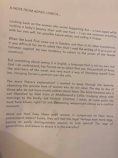 I wanted to peep through the keyhole, observing the private lives of women who do not rebel. The day to day of those who do not have novels written about them. The Anna Karenina who is not liberated by that train or Middlemarch's Celia, trudging along with marriage to the kindly, but thickish, Chettam. I mean, at some point she must have blown, right? Or not. Deepening, weaponised silence as a conflict measure.This was a curious experience. I started reading Supporting Act thinking after the first several pages whether if I would even persevere with it. The main character is a woman who starts off so subservient in her role as mother and homemaker I thought that it might be cringe reading throughout. But gradually that shifted and I started to find it to be a compulsive read after all.