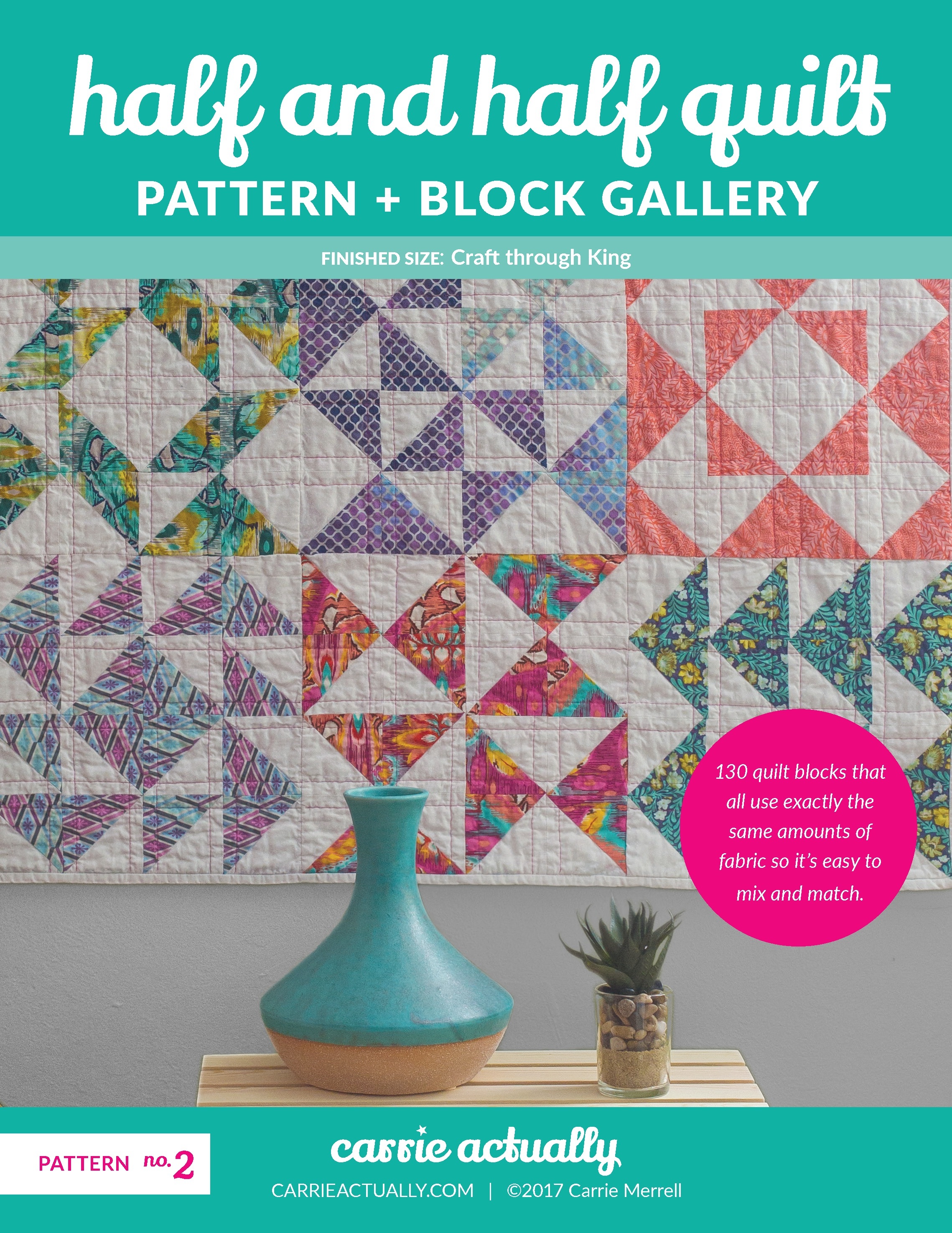 The pattern includes material requirements and instructions to make half square triangle quilts from craft size to king size and is fat quarter, fat eighth, yardage, jelly roll, charm square, and layer cake friendly.