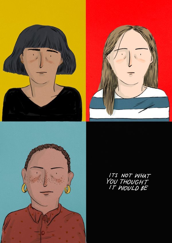 I didn't like all the illustrations here, but some I did. I liked the stories, but I didn't like there were many, because at first I thought this is so messy until I understood it has many different stories. But I liked the main story where two friends just chat with each other, as teens and as adults. This felt so real it hurt. I wish I had a friendship like theirs, because I have one ex-friendship that really didn't go as I thought it would be, as didn't go my life either. This has many good notes of daily lives, I envy those who can write so sharply from a daily life.