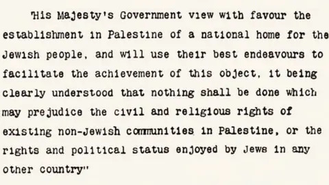 His Majesty's Government view with favour the establishment in Palestine of a national home for the Jewish people, and will use their best endeavours to facilitate the achievement of this object, it being clearly understood that nothing shall be done which may prejudice the civil and religious rights of existing non-Jewish communities in Palestine, or the rights and political status enjoyed by Jews in any other country.