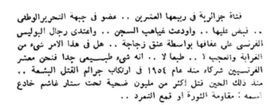 لم أعتد يوماً تقييم حياة أي إنسان ، فمابالكم بتقييم قصة عذابه ، خاصة أن هذا الإنسان مناضلة جزائرية ضد الاحتلال الفرنسي .. الجزائرية التي هزت الرأي العام وحركت سياسيين وكُتّاب وناشطين لإعادة الحق لأهله وإزالة الظلم الواقع عليهم ..
