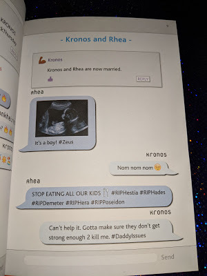 Okay, once again I was blown away by the immensely creative way this book was written. As an adult, some of the text shortcuts were not ones I understood or knew what they meant, but fortunately there was a bit of a glossary to help with that. As a high school librarian, I love how well this explains in an easy to understand way the Greek myths and really how messed up all of those gods were. It only took me two thirty minute lunch breaks to read this, as it is a very quick read. But I was laughing and snorting the whole time! I even passed it on to one of the teachers in my school who used to teach mythology, and he loved it, and returned it me later that same day! I don't know if enough teachers know about these books, but I am going to try to get out there and share them with teachers more, as they are some of the best ways to get someone interested in all these crazy stories. So many parts that were snarky and just hilarious. The only thing that maybe I had an issue with was the WTF and FML abbreviations. Knowing what the "F" stands for did bother me a bit. However I also know that teens are using those abbreviations, so it is probably a bit naive to expect that would be anything new for them.
