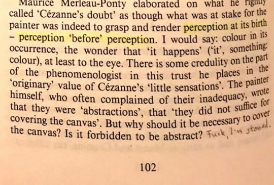 He says in a chapter on American artist Barnett Newman, “A canvas by Newman draws a contrast between stories and its plastic nudity. Everything is there—dimensions, colours, lines---but there are no allusions. So much so that it is a problem for the commentator. What can one say that is not given?... SO many expressions of a feeling which does have a name in the modern aesthetic tradition…. the sublime. It is feeling of ‘there’… There is almost nothing to ‘consume,’ or if there is, I do not know what it is. One cannot consume an occurrence, but merely its meaning. The feeling of the instant is instantaneousness.” (Pg. 80)