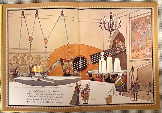 The protagonist king thinks bigger is always best. What he demands becomes more and more ridiculous and wasteful as the pages go on. The hyperbole makes for a captivating read.