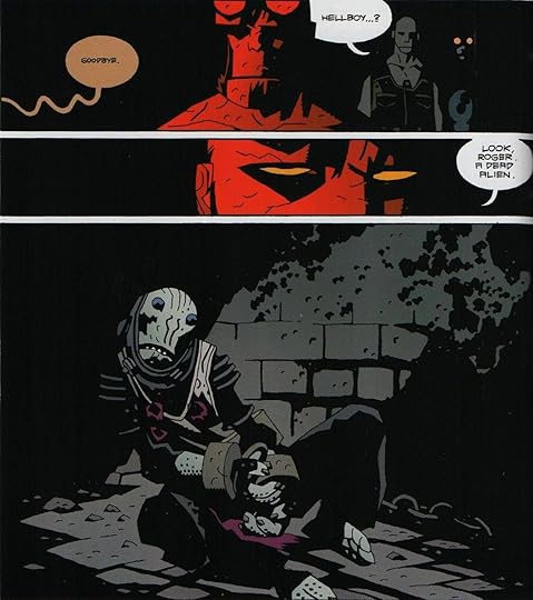 This character goes way back in the Hellboy universe, to a bit part in The Conqueror Worm. It was so long ago, that I forgot this character’s existence. The place of aliens in the Hellboy universe - that is alien life with inanimate technology similar to humans, rather than eldritch cosmic beings of yore - has been a sticky point and only mentioned in that one comic for a total of two pages. Hellboy gets a warning from the alien, the creature dies, and Hellboy remarks, “Roger look. A dead alien.” I remember being fascinated at the time, figuring the series was about to go in a weirder direction, but it was never mentioned again and I sort of forgot about it.
