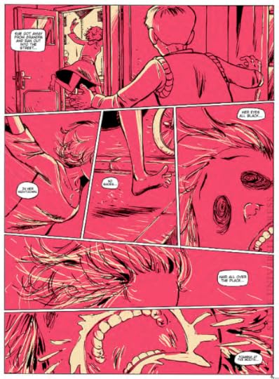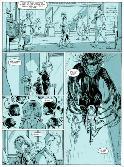 The art is ugly but I think it's almost perfect for this type of book. Schizophrenia isn't pretty and neither is the art. Espé is good at capturing schizophrenia in his drawings. Some examples are when schizophrenia is a huge shadow monster following his mother around and touching her with its tentacles, or when she succumbs to schizophrenia Espé portrays her as diving into a red pool, submerged in a blood-like substance.