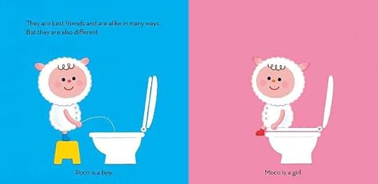 This might work better as a book in a family home or public library rather than in a school setting. This is due to the pages that tell the gender of the twins. The illustrations show Poco standing on a stool in front of the toilet, with an arc of dotted lines to signify that he is using the bathroom. Moco is shown seated on the toilet. Some families are very sensitive about the privacy of bathroom activities and might be upset about these illustrations, even though no body parts are shown. Teachers and librarians know their community and can make the decision that will best serve their students.