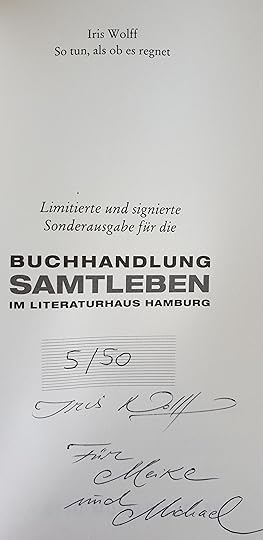So kenne ich den besten Buchhändler der Welt schon seit seiner Zeit in Eutin (lang, lang ist´s her): Wenn er von einem Buch überzeugt ist, tritt er leidenschaftlich dafür ein und findet ihm viele, viele Leser. So geschehen auch mit Iris Wolffs SO TUN, ALS OB ES REGNET , das Stephan Samtleben uns schon im letzten Sommer ans Herz gelegt hatte. Der Otto Müller Verlag war allerdings sehr erstaunt & erfreut, als er feststellte, dass die Buchhandlung Samtleben (im Literaturhaus Hamburg) alleine gut 500 Exemplare des Titels unter die Leser gebracht hat. Dazu wäre anzumerken, dass es sich um eine sehr engagierte und ausgezeichnete, aber flächenmäßig doch kleine Buchhandlung handelt, die von Stephan Samtleben alleine geführt und betrieben wird (https://uniscene.de/news/lang_lebe_di...). Der Verlag würdigte Stephans Engagement auf eine Weise, die wohl einmalig sein dürfte: Obwohl die Autorin durch die Verkaufszahlen das Interesse größerer Verlagshäuser auf sich gezogen hat und möglicherweise den Verleger wechseln wird, ließ Otto Müller eine Sonderauflage von 50 Exemplaren drucken, limitiert und signiert für die Buchhandlung Samtleben. Das nenne ich doch mal ein Dankeschön! Und ich bedanke mich bei Stephan, dass er uns die Nummer 5 überlassen hat!