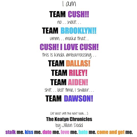 There was some tension going on between Dawson and Aiden... I started out Team Aiden 100%, then I was Team Dawson for just a minute.... Now- I am conflicted. I think I am still Team Aiden... It's just so hard to decide! Although I have a HUGE soft spot for Riley and Dallas- just not for Keatyn! And In the first book I was Team Cush... but there was B who Keats just adored- well, not anymore! Brooklyn- you really sucked in this book! I am seriously glad the next book will be out in a few months! I cannot wait to see what happens next!!!