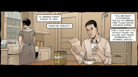 I’m not sure if anyone knows how HP Lovecraft actually spoke but Moore gives him the most wanky speaking style possible here, having him make grandiloquent exclamations and calling old people young and vice versa for no reason. “Why, my dear Robertus! Please be afforded ingress to my meagre sanctuary. I trust my young granddaughter here has not already wearied you with her girlish entreaties?” Gah - it’s so annoying!