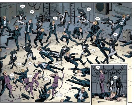 That's in large part because of Kate's unique viewpoint and her great kick-assedness. From Young Avengers we know that she's a truly superior fighter, but that's played up even more here. Combine that with her immediate ability to read a room, depicted with hilarious art throughout this volume, and you get a really enthralling character.
