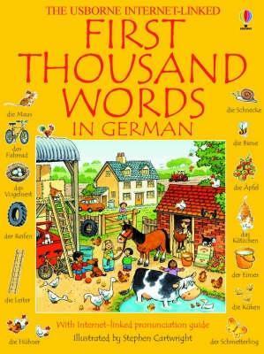 First Thousand Words in German is a simple, straightforward introduction to the German language for young children. After a brief explanation of masculine/feminine/neuter words and pronunciation, the book consists entirely of German words, each with an accompanying illustration, all grouped into a variety of themes; for example, one theme is "Sport," which teaches readers the German words for "windsurfing" and "Sumo wrestling," among others. While some themes are just a list of words and pictures, others depict a scene, such as a crowded beach, with the words and pictures listed around the edges.