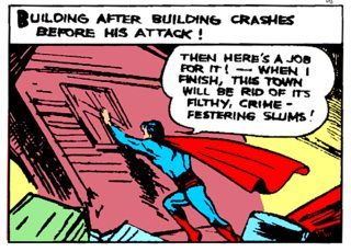 Superman decides to completely destroy an entire neighbourhood so someone comes and builds better housing, which supposedly happens in a few weeks but no mention of if the people living in those slums could afford to live in the new apartments. Do like it though, how superman just decides if he wrecks shit it'll solve the problem regardless of laws or the military being sent after him lol.