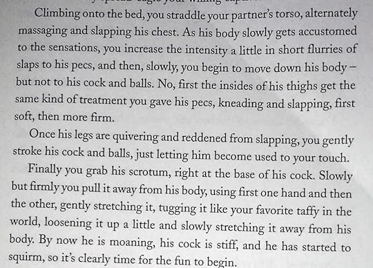But my favorite bit was the 'recipes' pp. 63-120. This is pure genius. Here Haberman writes rather delicious story-type scenarios, which show how genital play might be performed with different pieces of equipment, in a safe manner, paying attention to the needs of the bottom, incorporating all the safety tips etc which Haberman has previously introduced.
