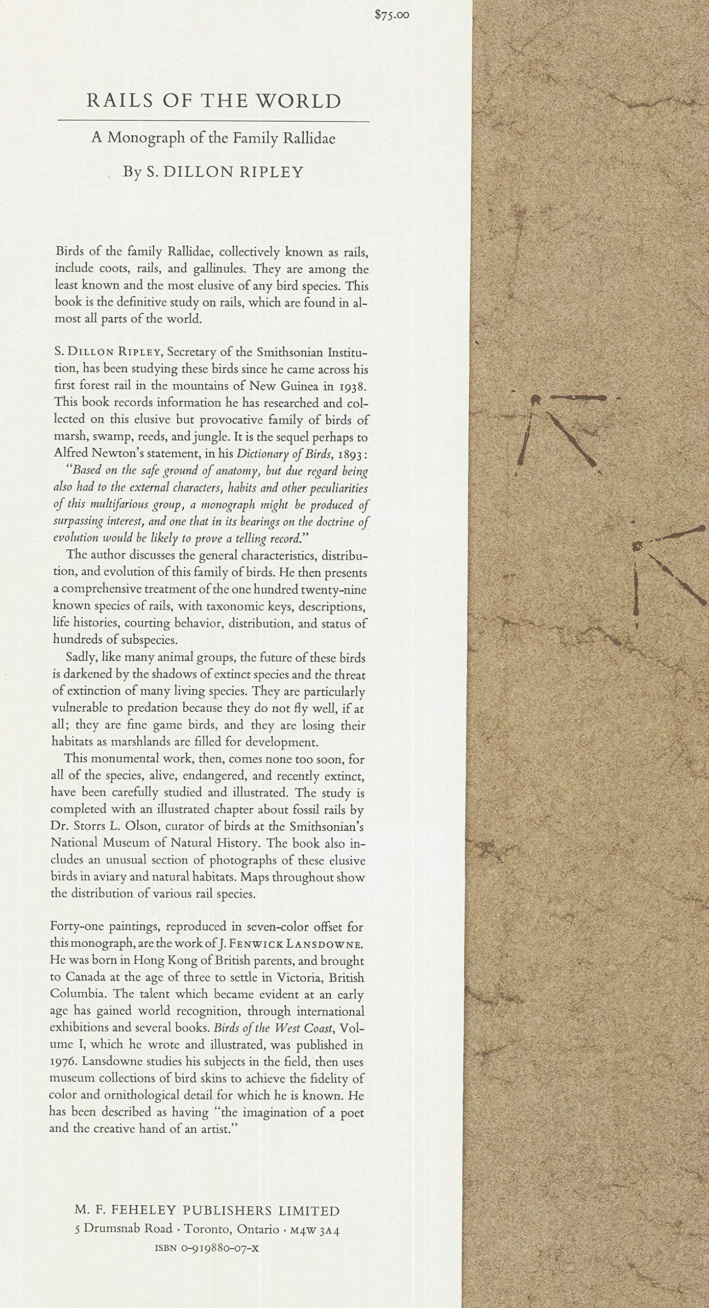 "Dillon Ripley, the Secretary of the Smithsonian Institute, a scholar who knows the world's more esoteric birds perhaps as well as anyone, and Fenwick Lansdowne, one of our finest bird portraitists, have combined their talents to produce a work which will be coveted not only by serious ornithologists but also by every collector of fine natural history books." —Roger Tory Peterson