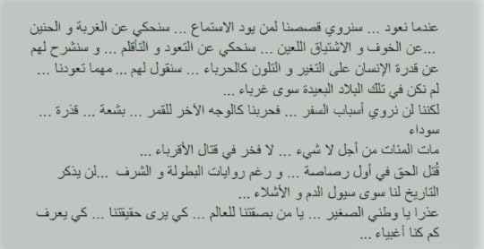 شعرت باحساسه الصادق في هذه النصوص وكذلك تعرض لقضايا مهمة من قضايا مجتمعني العربي ومشاكل بلدانن والغربة الاجبارية لابناء الوطن واشتياقات هذا المغترب لوطنه الذي يدفعه الى الهجرة.