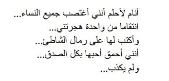 1- لمست جرحي النازف خاطرة الأم وخاطرة الغربة 2- لا أحبذ -اطلاقا- النصوص التي تخلو من الحياء وإن كتبناها فلا حاجة لنشرها 3-أهنئ الكاتب على خصلة نادرة في مؤلفات الكتاب الجدد : لم يقع في الأخطاء اللغوية والتركيبية الحمقاء وهذا إن دلّ على شيء فإنما يدل على أنه قارئ ذكي 4- أغلب النصوص لا تحمل إيقاعا داخليا وكذا الحال مع الايقاع الخارجي 5-لن ألوم كل من كتب مشاعره وسماها قصائد نثرية ليكون تحت راية هذا المصطلح شاعرا ..لكنّني ألعن أدونيس ليل نهار لأنه قضى على مفهوم الشعر ليرضي نرجسيته فواكبه الكثيرون غفلة أو تغافلا ... 6-أنصح الكاتب بالتركيز على دواوين الجهابدة من الشعراء لصقل الموهبة أكثر ، كما أن الضرورة الشعرية تلزمه بالاهتمام بكتب العروض وصناعة الشعر