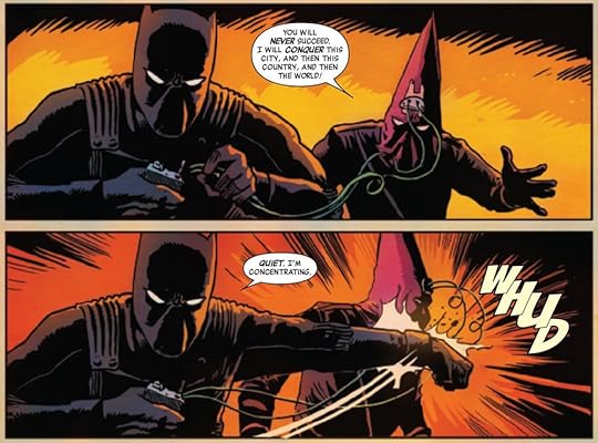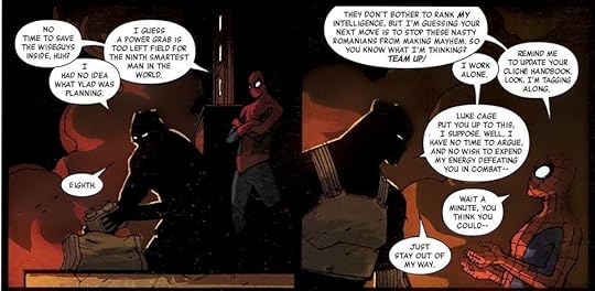 Pretty darn good. Black Panther takes over as the protector of Hell's Kitchen while Daredevil is... away... somewhere. He attempts to "find himself" through this change of pace, having lost his title and his superpowers. The majority of this book is basically a Daredevil or Batman "street vigilante" style title, and as such I connected with it pretty well. Most of the plot was nothing too special, but it kept me engaged and interested. The best storyline was definitely one where the "Hate-Monger" comes by and inspires a bunch of racism and immigrant-hate all across New York. They tread a fine line in showing that the Hate-Monger does have mind control powers that he uses to stoke the fear and hatred and start riots etc. but that all those feelings don't come from nowhere. It was a really powerful story that honestly is super-relevant right now in 2018 (this series was originally written in 2011ish). By far the most compelling reason why this book was so good to me was the primary artist: Francisco Francavilla. I first saw his work in Batman: The Black Mirror, and he also did the Afterlife with Archie zombie series. His work is unmistakable, with his inky blacks washing over everything, with pops of color. Most of his pages are focused on one color, sometimes two for effect. Most often he works in an autumnal color scheme, with reds and oranges, and the occasional blue or purple to contrast. He's very unique and one of my favorite artists, and it was really nice to get such a large run of issues by him. Most of the other artists in the book were pretty good too, which was nice.