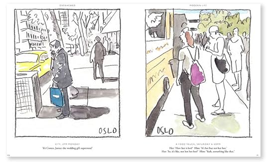 a collection of sentences the author overhead, that sounded bizarre, funny, absolutely in need for context, or just wrong and offensive, just like what you might expect from people talking without realizing they’re being heard by some strangers around. Oslo’s art is very sweet, the premise is very interesting, i hope to see it in a philosophical, poetic, and artistic setting someday. the book was a fun time.
