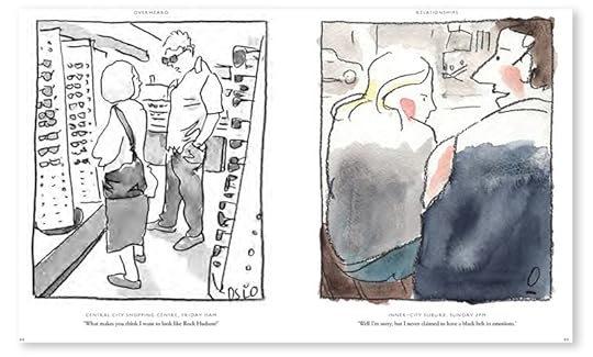 Oslo Davis has made a career of recording his observations of 'life in the city' for us all to enjoy. His Overheard cartoons capture the hilarious and the crazy, banal and sillyness of everyday life. While Oslo snoops on what people are talking about, we get to reflect on, and laugh at, the crazy things that occupy people's minds. The daughter telling her mother not to interfere in party preparations, the fat man pondering what is least bad to eat, the hipster commenting on what is truly hip.
